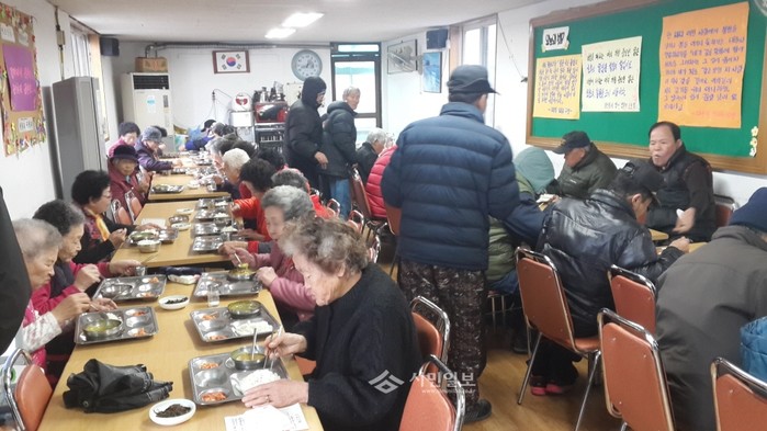 경기 수원시 권선구 세류2동 주민복지협의체는 최근 무료급식소에서 직원들과 함께 자원봉사를 실시했다. 사진은 무료급식소를 찾은 노인들이 식사를 하는 모습.(사진제공=권선구청)