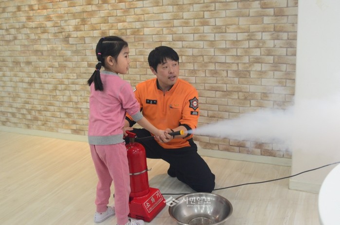 최근 서울 영등포소방서는 토토빌어린이집에서 보육교사와 어린이들을 대상으로 소방안전체험교육을 실시했다. 사진은 교육에 참석한 어린이가 소화기 사용 실습을 하는 모습.(사진제공=영등포소방서)