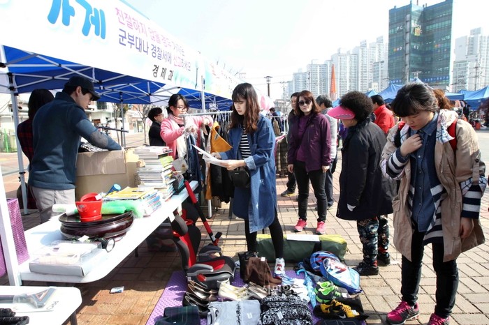 지난 19일 인천시 동구는 동인천역 북광장에서 구청 각 부서 공무원 및 주민들과 ‘동구청 전직원과 함께하는 나눔장터’ 행사를 개최했다. 사진은 행사 참가자들이 나눔물품을 전시하고 있는 모습.(사진제공=동구청)
