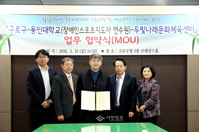 최근 구로구는 구청 3층 르네상스홀에서 용인대학교 장애인스포츠지도자 연수원, 두빛나래 문화체육센터와 발달장애인 재활지원을 위한 업무협약을 체결했다. 사진은 이성 구청장(오른쪽에서 두 번째)과 관계자들이 기념촬영을 하는 모습.(사진제공=구로구청)