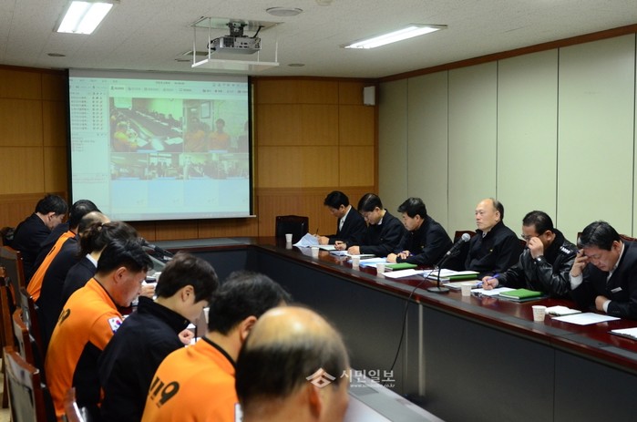 지난 21일 서울 영등포소방서는 소방서 3층 회의실에서 ‘소통과 화합을 통한 신바람나는 일터 만들기’의 일환으로 화상(영상)회의 시스템을 이용해 119안전센터와 공유하는 열린회의를 개최했다. 사진은 소방대원들이 화상회의를 진행하고 있는 모습.(사진제공=영등포소방서)