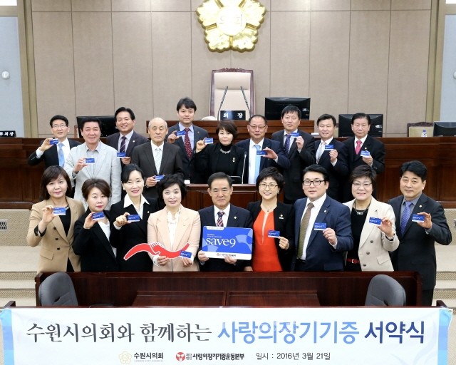 이날 21명의 수원시의원(김진우ㆍ이재식ㆍ김기정ㆍ김미경ㆍ김은수ㆍ박순영ㆍ백종헌ㆍ염상훈ㆍ유재광ㆍ이미경ㆍ이종근ㆍ이철승ㆍ이혜련ㆍ조돈빈ㆍ조명자ㆍ조석환ㆍ최영옥ㆍ한규흠ㆍ한명숙ㆍ한원찬ㆍ홍종수 의원)은 생명을 나누겠다는 아름다운 서약을 했다.