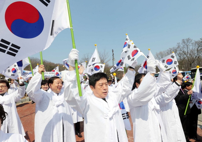 지난 21일 경기 용인시는 처인구 원삼면 좌전고개에 위치한 3.1만세운동 기념탑에서 정찬민 용인시장을 비롯해 시민 등 500여명이 참여해 '3.21만세운동' 기념행사를 개최했다. 사진은 정찬민 시장(가운데)이 만세운동 재현행사를 진행하고 있는 모습.(사진제공=용인시청)
