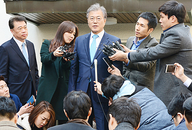 문재인 더불어민주당 전 대표가 22일 오후 서울 종로구 구기동 김종인 더불어민주당 비상대책위원회 대표 자택을 나와 취재진 질문에 답변하고 있다.
