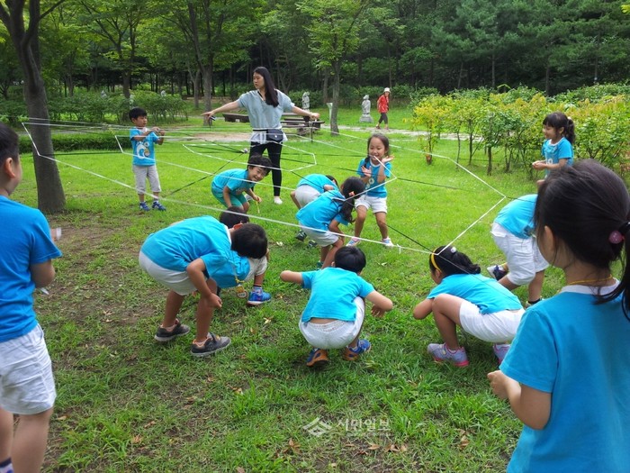 | ▲ 지난해 '유아숲속교실'에 참여한 어린이들이 거미줄 통과 놀이를 하고 있다. | ||