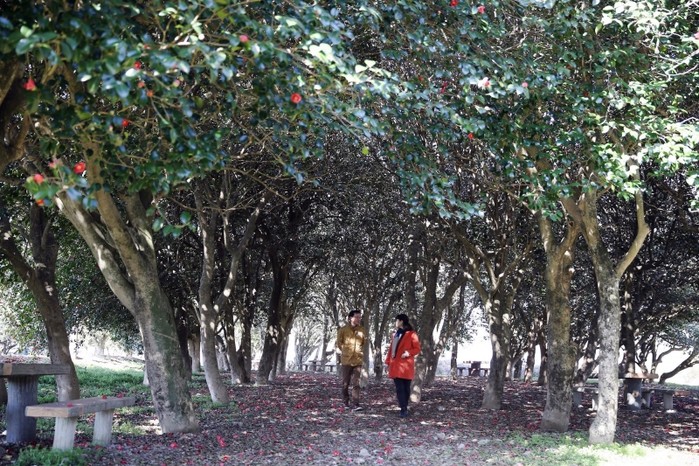 지난 22일 전남 장흥군 용산면 묵촌마을의 동백림에 동백나무 꽃이 피며 봄이 왔음을 알리고 있다. 묵촌마을 앞 들판에는 마을에 액운이 오는 것을 막기 위해 140여 그루의 동백나무가 하천을 따라 심어져 있다. (사진제공=장흥군청)