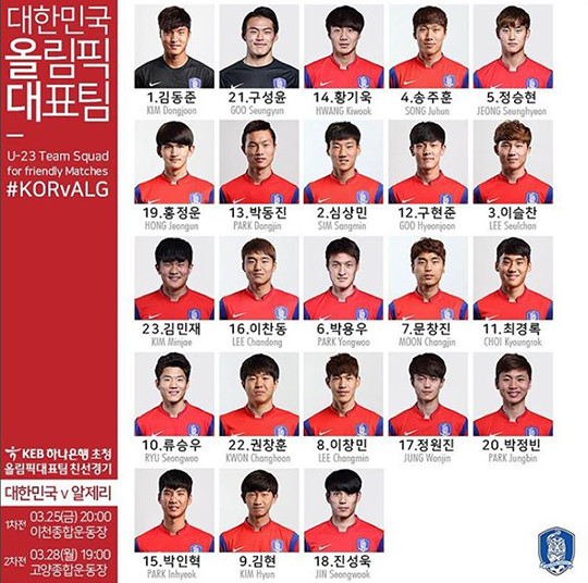 또 성인 대표팀과 올림픽대표팀에서 모두 활약하고 있는 권창훈(수원)은 22번을, 공격수 김현(제주)는 9번을 배정받았다.