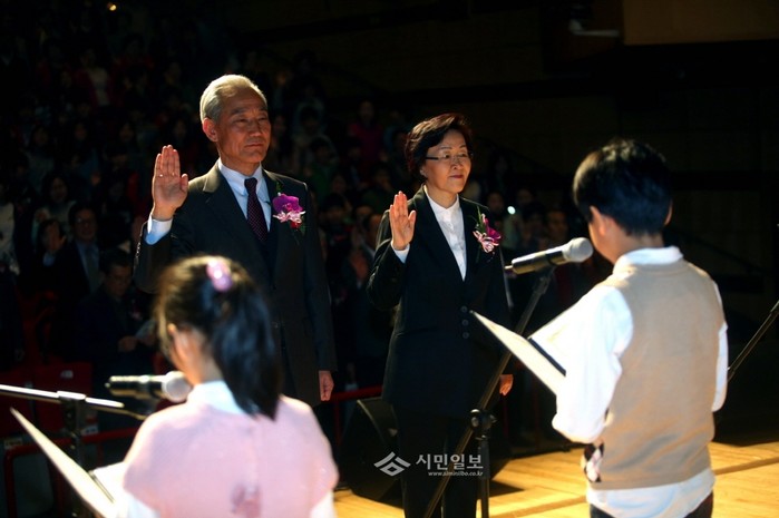 지난 22일 강남구는 구민회관에서 '세계 물의 날 기념행사'를 개최했다. 사진은 행사에 참석한 신연희 구청장(오른쪽)이 김종훈 국회의원(왼쪽)과 함께 환경선언 선서를 하는 모습.(사진제공=강남구청)