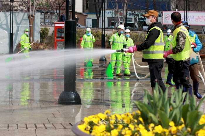 지난 23일 성동구는 동별 직능단체 회원, 공무원, 주민 등 250여명이 참여한 가운데 왕십리광장을 시작으로 '새봄맞이 대청소'를 실시했다. 사진은 행사 참가자들이 물청소를 하고 있는 모습.(사진제공=성동구청)