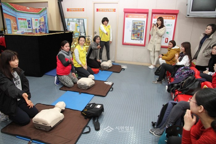 지난 23일 서울 동작소방서는 다문화가정 여성들을 대상으로 다문화사회 민주시민 리더교육 중 시민안전파수꾼 양성교육을 실시했다. 사진은 교육 참가자들이 심폐소생술 실습을 진행하고 있는 모습.(사진제공=동작소방서)