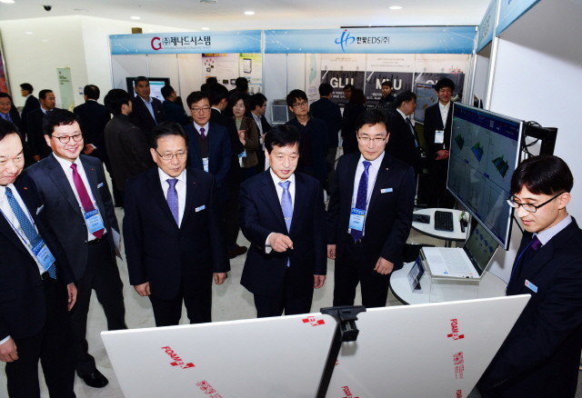 | 장재원 한국전력 전력계통본부장(가운데)이 IoT개발회사들의 송변전 예방진단 시스템 관련 장비 전시부스를 돌아보고 있다. | ||