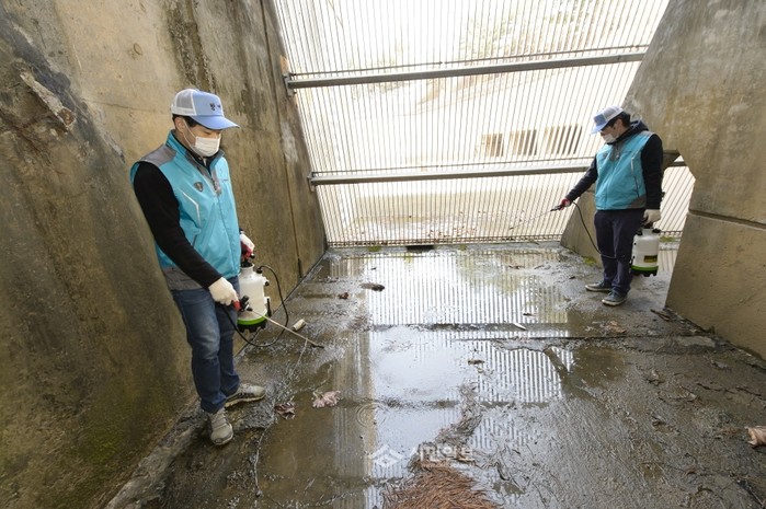 지난 23일 오전 서울 양천구 방역기동반이 신정동에 위치한 '오금빗물펌프장' 내부에서 모기 퇴치 및 구충 구제를 위한 방역을 실시하고 있다.(사진제공=양천구청)