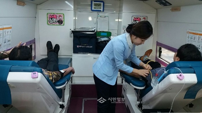 최근 서울 은평구는 대한적십자사 혈액관리본부로부터 헌혈차량 2대를 지원받아 구청광장에서 구·동 소속 공무원과 공익요원 등 100여명이 참여한 가운데 헌혈행사를 실시했다. 사진은 행사 참가자들이 헌혈하고 있는 모습.(사진제공=은평구청)