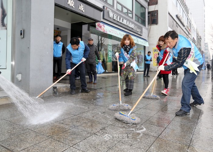 지난 23일 서울 금천구는 차성수 구청장을 비롯해 클린마을 봉사단, 직능단체, 주민, 공무원 등 1200여명이 참여한 가운데 ‘새봄맞이 특별 대청소’를 실시했다. 사진은 차 구청장(오른쪽)이 인도를 물청소하는 모습.(사진제공=금천구청)