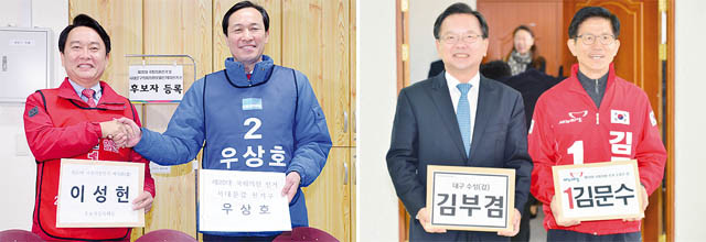 제20대 국회의원 선거 후보자 등록이 시작된 24일 서울 서대문구 선거관리위원회에서 새누리당 이성헌 후보와 더불어민주당 우상호 후보가 등록을 마친 후 악수를 나누고 있다(왼쪽). 같은 날 오전 대구 수성구선거관리위원회에서 대구 수성을 새누리당 김문수(오른쪽) 후보와 더불어민주당 김부겸 후보가 접수 서류를 들고 기념촬영을 하고 있다.
