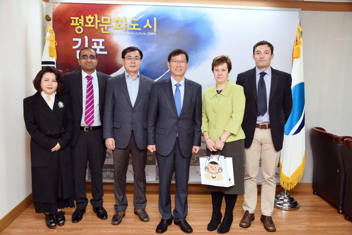 최근 경기 김포시는 수 키노시타 주한 영국대사관 부대사, 영국 ‘Future Cities Catapult’사 등과 스마트시티 구축을 위한 한·영 교류협력 회의를 개최했다. 사진은 유영록 시장(오른쪽에서 세번째)과 수 키노시타 주한 영국부대사(오른쪽에서 두 번째) 및 관계자들이 기념촬영을 하는 모습.(사진제공=김포시청)