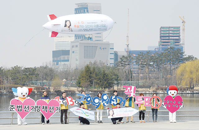경기도선거관리위원회가 27일 경기 일산 호수공원 한울광장에서 진행한 제20대 국회의원선거 홍보 ‘유권자 시선을 잡아라’ 캠페인에서 무인 비행선을 띄워 유권자들의 투표참여를 독려하고 있다.