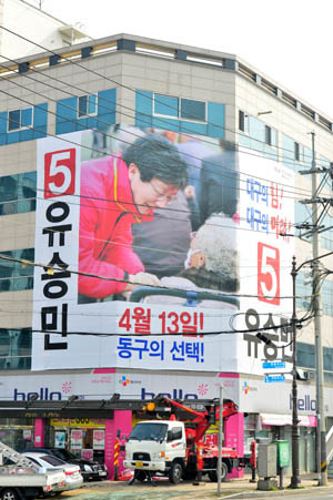 26일 오전 대구 동구 무소속 유승민 후보 선거사무소에 기호 ‘5번’이 새겨진 새 현수막이 설치돼 있다. 새누리당을 탈당하고 무소속으로 출마한 유 후보는 동구선거관리위원회로부터 기호 5번을 부여받았다.