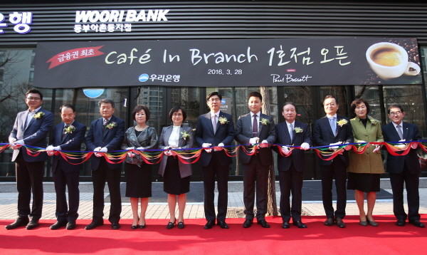 [시민일보=고수현 기자]우리은행(은행장 이광구)이 28일 금융권 최초로 은행과 프리미엄 커피브랜드인 폴바셋(Paul Bassett)의 콜라보레이션 점포인 '동부이촌동지점 카페 인 브랜치(Cafe In Branch)' 개점식을 열었다.