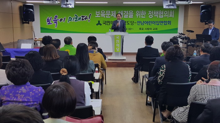 국민의당 전남도당과 전남어린이집연합회가 공동 개최한 보육문제 해결을 위한 정책협의회에서 이중규 전남어린이집연합회장이 인사말을 하고 있다.