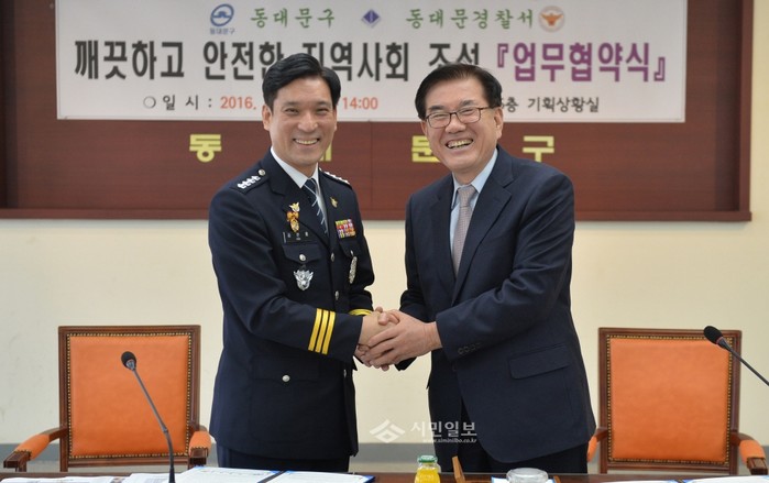 지난 28일 유덕열 동대문구청장(오른쪽)과 김진홍 동대문경찰서장이 구청 기획상황실에서 '깨끗하고 안전한 지역사회 조성을 위한 업무협약'을 체결하고 기념촬영을 하고 있다. (사진제공=동대문구청)