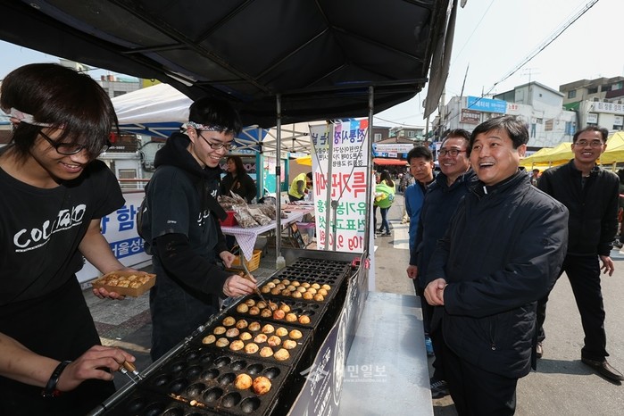 최근 김영배 성북구청장은 250여 참가팀이 정릉천을 따라 팔장·손장·배달장·알림장·수리장·소쿠리장을 열어 수제 잼, 향초 등의 상품을 판매한 '정릉 개울장 현장탐방'을 실시했다. 사진은 김 구청장(오른쪽)이 시장내 다코야키 판매 상인들과 이야기를 나누는 모습.(사진제공=성북구청)
