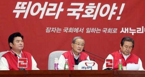 새누리당 강봉균 공동선대위원장이 29일 오전 국회에서 열린 첫 선거대책위원회 회의에서 7대 주요 경제공약 중 '청년일자리 창출을 위한 기업투자 활성화'와 '성장률 3% 이상 유지를 위한 거시 경제정책 운용'에 대해 설명하고 있다.