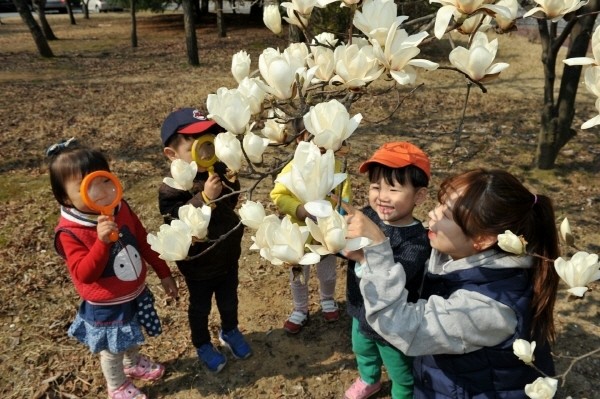 전남 광양시 금호동 광양제철소 주택단지 곳곳에 목련, 개나리, 벚꽃 등 봄의 전령사인 꽃들이 활짝 피어 봄의 향기를 물씬 풍기고 있다. 사진은 지난 28일 어린이집에 활짝 핀 목련을 아이들이 호기심 어린 눈으로 살피고 있는 모습.
