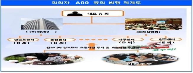 ㈜비○○○ 대표이사 A(62)씨는 영등포 센터, 청주 센터, 춘천 센터, 대구 센터 등을 운영하며 전국 규모의 투자유치 조직을 구축하고 노인·가정주부 등을 상대로 투자 설명회를 통해 투자자를 모집한 다음 초기에는 약정대로 투자금의 1.2%의 수익금을 매일 지급하며 피해자들이 수익금으로 받은 돈도 재투자하도록 하였다.