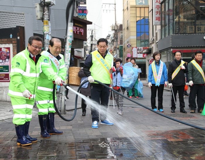 지난 29일 서울 마포구는 서교동 '홍대 걷고싶은 거리' 일대에서 지역주민, 상인, 시민단체 회원, 공무원 등 260여명이 참석한 가운데 '봄맞이 대청소 행사'를 실시했다. 사진은 박홍섭 구청장(왼쪽에서 두 번째)과 차재홍 마포구의장(맨 왼쪽)이 봄맞이 대청소에서 거리 물청소를 하고 있는 모습.(사진제공=마포구청)