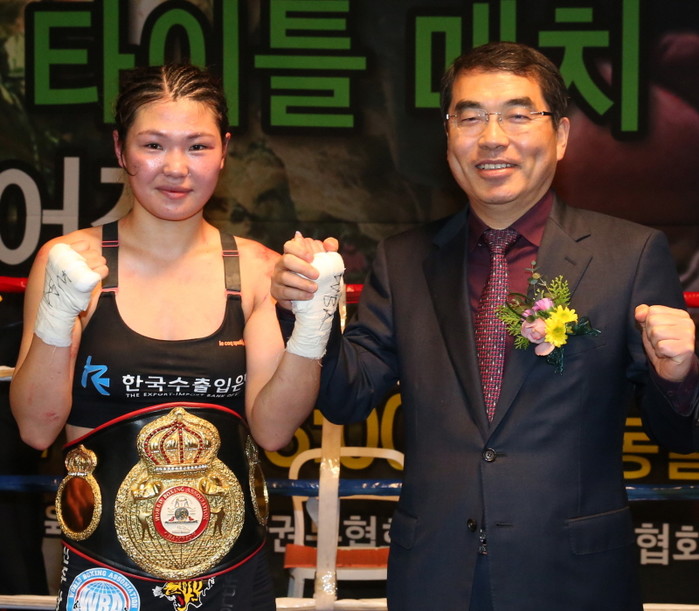 지난 27일 경기 광명동굴 특설링에서 열린 WBA세계슈퍼페더급 3차 방어전에서 탈북여성복서 최현미 선수(25)가 도전자인 콜롬비아 다이애나 아얄라 선수(25)에게 판정승을 하자 양기대 광명시장이 특설링에서 최 선수와 함께 파이팅을 외치고 있다.(사진제공=광명시청)