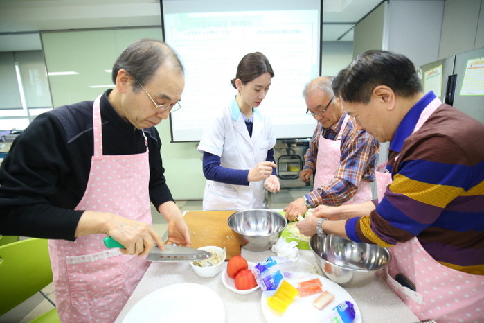 최근 서울 서초구 방배보건지소 식생활교육실에서 65세 이상 노인을 대상으로 위생적인 식품손질과 보관법, 냉장고 올바른 활용법, 저열량샐러드 만들기, 조리체험 등의 내용으로 진행한 ‘은빛요리교실 7기’ 수업에 참석한 노인들이 강사의 지시에 따라 요리를 만들고 있다.(사진제공=서초구청)