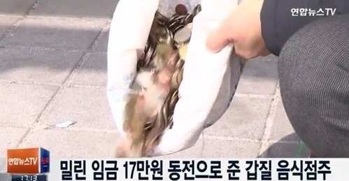 경기도 성남의 한 중국음식점에서 배달일을 하던 김 모씨는 밀린 임금을 주지 않는 업주를 노동청에 고발했고, 업주는 이와 관련 앙갚음하듯 17만원을 동전으로 지급했다.