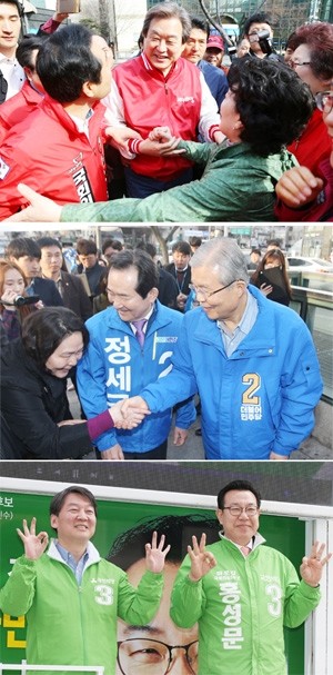 새누리당 김무성 대표가 4.13 총선 공식선거운동 첫 날인 31일 오전 서울 구로구 이마트 앞에서 열린 강요식 후보 유세에서 지지자들에게 둘러싸여 환영받고 있다(왼쪽). 더불어민주당 김종인 비상대책위원회 대표가 4.13 총선 공식선거운동 첫날인 31일 서울 종로구 동묘앞역에서 열린 정세균 후보 지원유세에서 시민들과 악수하고 있다(중간). 국민의당 안철수 공동대표가 20대 총선 공식선거활동 시작일인 31일 오전 서울 이대역에서 마포구갑에 출마한 홍성문 후보의 지원유세를 하고 있다.