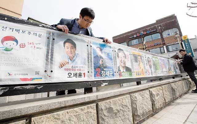 31일 오전 서울 경복궁역 출구에서 중앙선거관리위원회 관계자들이 제20대 국회의원 총선거 종로구 후보자 선거 벽보를 붙이고 있다.