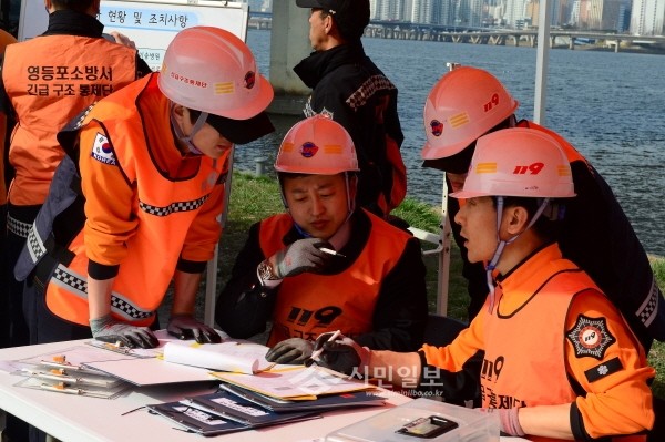 최근 서울 영등포소방서는 여의도 유람선 선착장에서 테러가 의심되는 폭발 및 화재가 발생 한 가상 상황을 설정하고 재난 대응능력 향상을 위한 불시 긴급구조통제단 가동 훈련을 실시했다. 사진은 훈련에 참석한 관계자들이 회의하는 모습.(사진제공=영등포소방서)