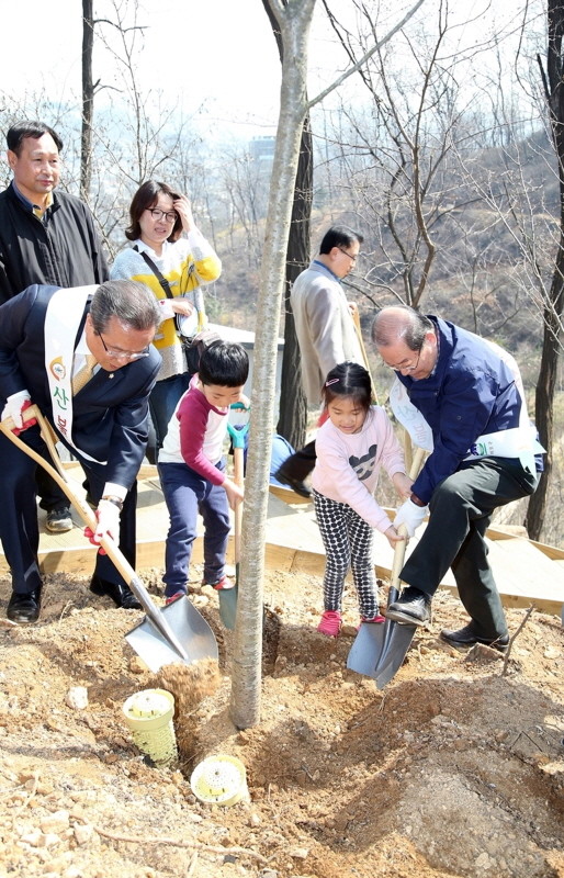 지난 1일 오전 식목일을 맞아 서울 마포구 성산동 성미산에서 열린 ‘벚꽃길 산책로’ 조성을 위한 나무심기 행사에서 박홍섭 구청장(맨 오른쪽)과 차재홍 구의장(맨 왼쪽)이 아이들과 함께 왕벚나무를 심고 있다.(사진제공=마포구청)