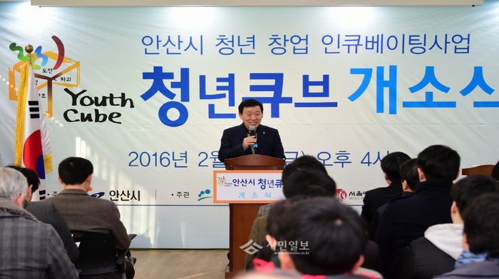 | ▲ 제종길 안산 시장(가운데)이 청년들의 창업을 지원하는 '청년큐브' 개소식에서 축하인사를 전하고 있다. | ||