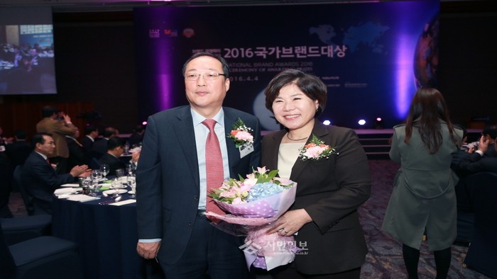 4일 서울 서초구 '반딧불센터'가 롯데호텔 2층에서 개최된 '2016 국가브랜드대상' 주민화합 공동체 브랜드 부문에서 대상을 받았다. 사진은 조은희 구청장(오른쪽)이 기념촬영을 하는 모습.(사진제공=서초구청)
