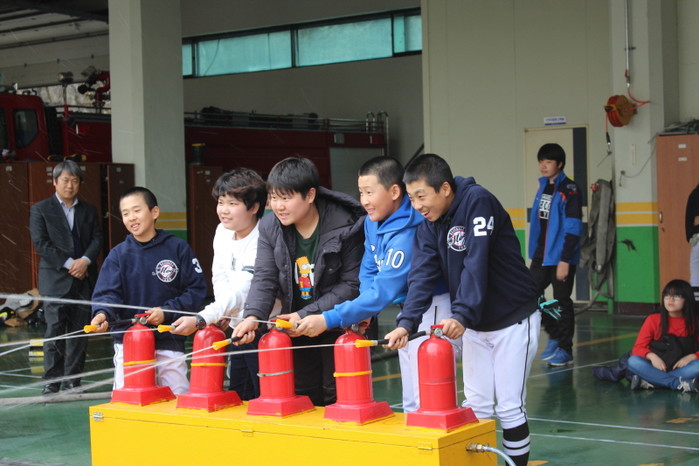 지난 1일 경기 이천소방서는 모가중학교 학생 22명을 대상으로 미래소방관 직업 체험교실을 운영했다. 사진은 학생들이 물소화기를 이용한 화재진압체험을 하는 모습.(사진제공=이천소방서)