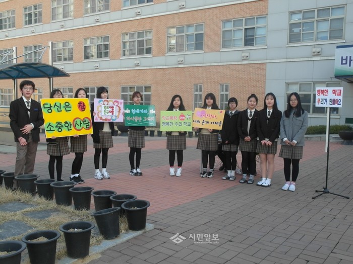지난 1일 충남 아산시 음봉중학교는 Wee센터와 Wee클래스의 협력행사를 통해 학교폭력예방 및 생명존중 교육을 실시했다. 사진은 학생들이 생명의 소중함과 학교폭력예방을 위해 만든 팻말을 들고 캠페인을 전개하는 모습.(사진제공=아산교육지원청)