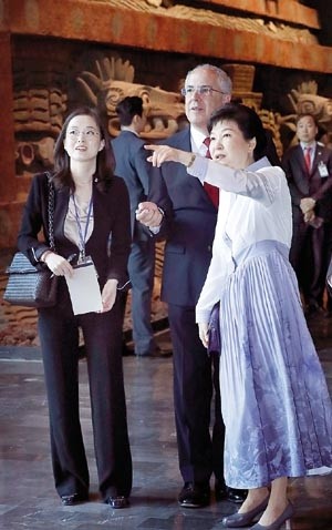 멕시코를 공식 방문중인 박근혜 대통령이 3일 오전(현지시간) 멕시코시티 국립인류학박물관을 방문해 안또니오 사보릿 박물관장(왼쪽 두번째)등 관계자로부터 고대문명 유물에 대한 설명을 듣고 있다.