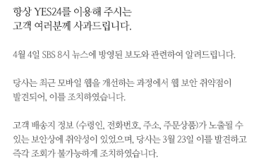 YES24 "바로 보완조치…악의적 배송지 유출 없다"