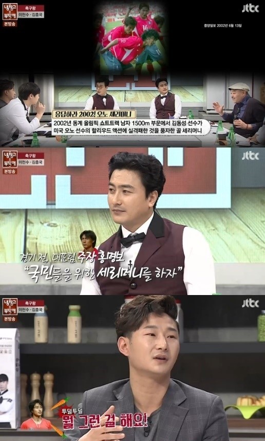 이날 이천수는 2002년 월드컵 당시 미국전 '오노 세레머니'에 대해 "그때 홍명보 선수가 주장이었는데 경기 전 국민들을 위한 세리머니를 하자고 제안했다"며 "안정환이 홍명보에게 '뭘 그런 걸 하냐'고 했던 거 같다"고 말했다.