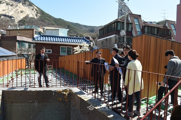 김성환 노원구청장(왼쪽에서 두 번째)이 지난 4일 오전 11시 공립형 지역아동센터 신축 공사현장을 방문해 공사 진행사항을 둘러보고 있다.(사진제공=노원구청)