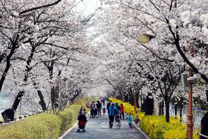 지난 2일 오후 따뜻한 날씨에 벚꽃이 활짝 핀 동대문구 장안동 벚꽃길에서 벚꽃 구경을 나온 시민들이 봄 경관을 즐기며 봄나들이를 즐기고 있다.(사진제공=동대문구청)