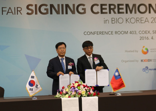 | ▲ ㈜대웅제약(대표 이종욱)이 1일 ‘바이오 코리아 2016’에서 대만 ‘오리엔트 유로 파마(Orient Euro Pharma)’사와 ‘나보타’ 수출 계약을 체결한 후 대웅제약 이종욱 부회장(왼쪽)과 대만 ‘오리엔트 유로 파마’ 해리 차이 본부장(Mr. Harry Tsai, General Manager)이 기념사진을 촬영하고 있다. | ||