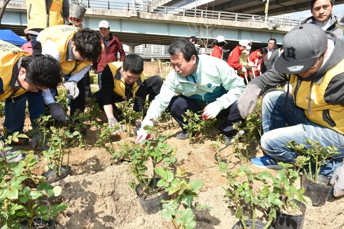 지난 5일 서울 중랑구는 묵동천 자연학습장 주변에서 '제71회 식목일 나무(장미) 심기' 행사를 진행했다. 사진은 행사에 참석한 나진구 구청장(오른쪽에서 두 번째)이 나무를 심는 모습.(사진제공=중랑구청)