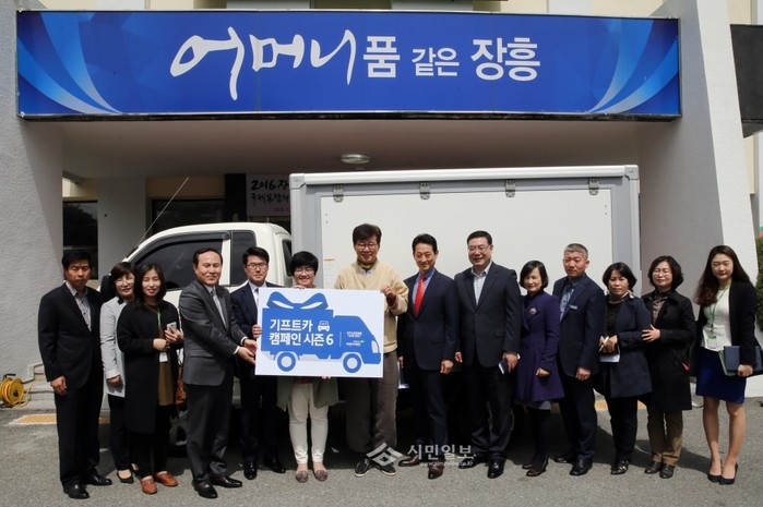 지난 5일 전남 장흥군은 현대자동차와 초록우산어린이재단이 함께하는 기프트카 전달식과 초록우산어린이재단 장흥사랑 아이사랑 후원금 1억5000만원 약정식을 개최했다. 사진은 김성 군수(가운데)와 관계자들이 기념촬영을 하는 모습.(사진제공=장흥군청)