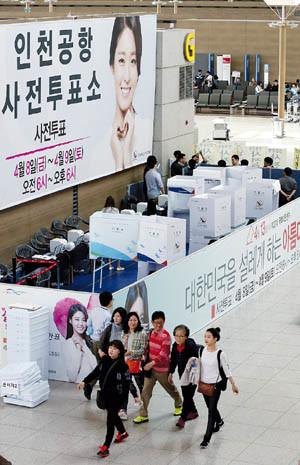 [=연합뉴스 기자]제20대 국회의원 총선거 사전투표를 하루 앞둔 7일 낮 인천시 중구 인천국제공항 출국장에서 인천시선관위 직원들이 사전투표소를 설치하고 있다.